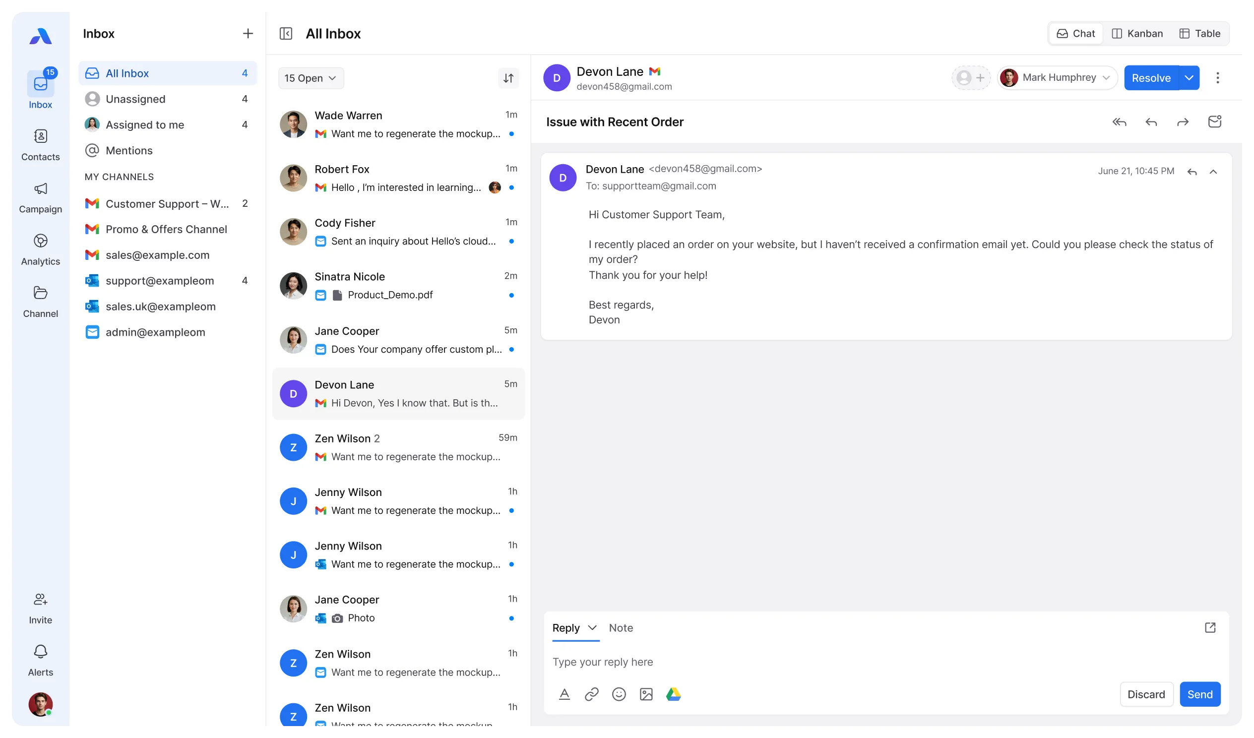 Manage Gmail, Outlook, and IMAP together with shared visibility, ownership, and accountability.