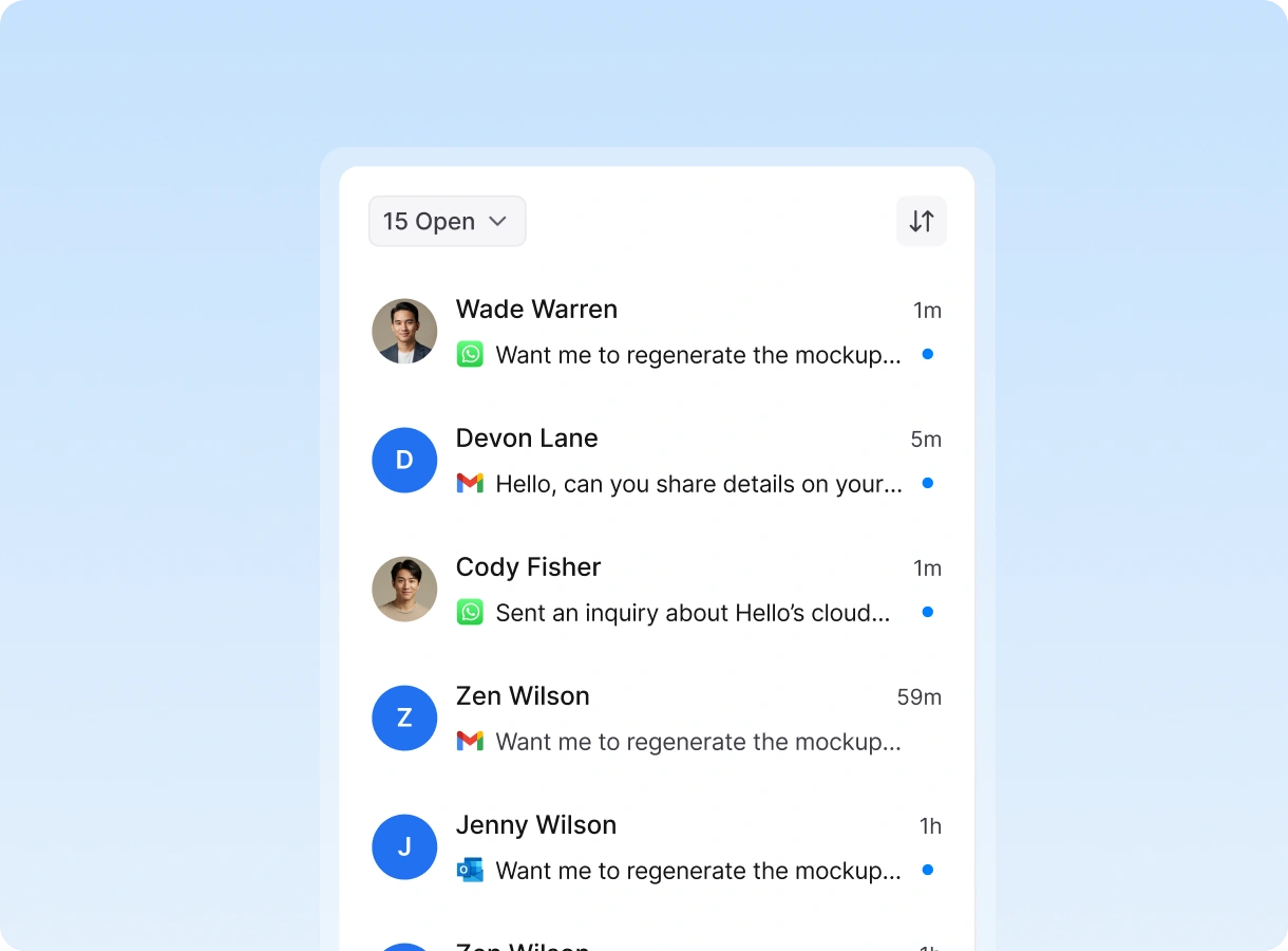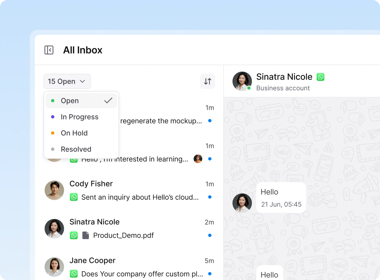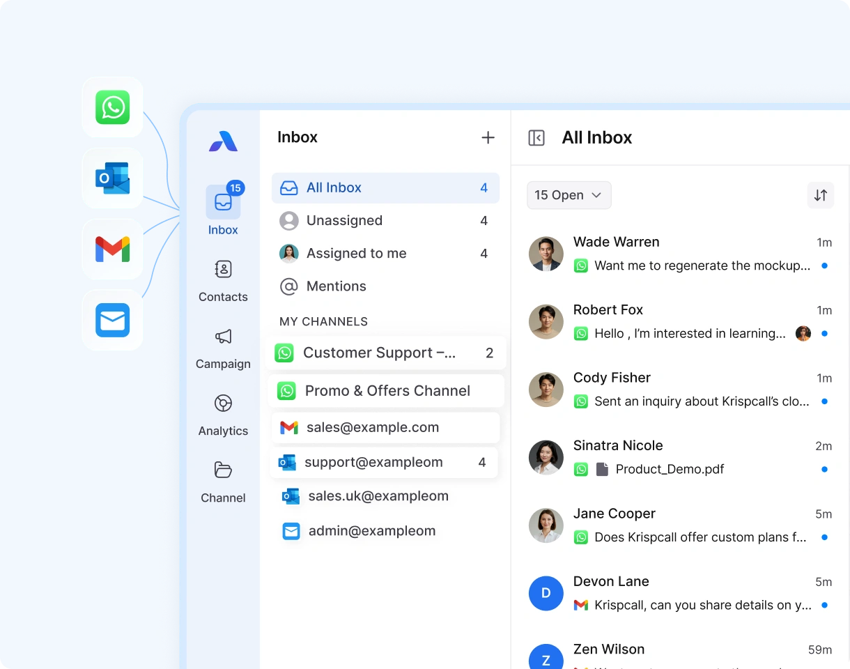 Manage WhatsApp and Email in one workspace. Every customer conversation is visible in real time, so your team stays on top of every interaction.